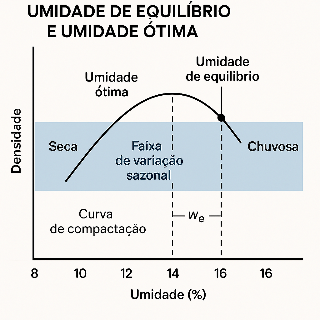 A umidade ótima define o ponto de compactação ideal, mas a umidade de equilíbrio é quem governa o comportamento a longo prazo da estrutura rodoviária.